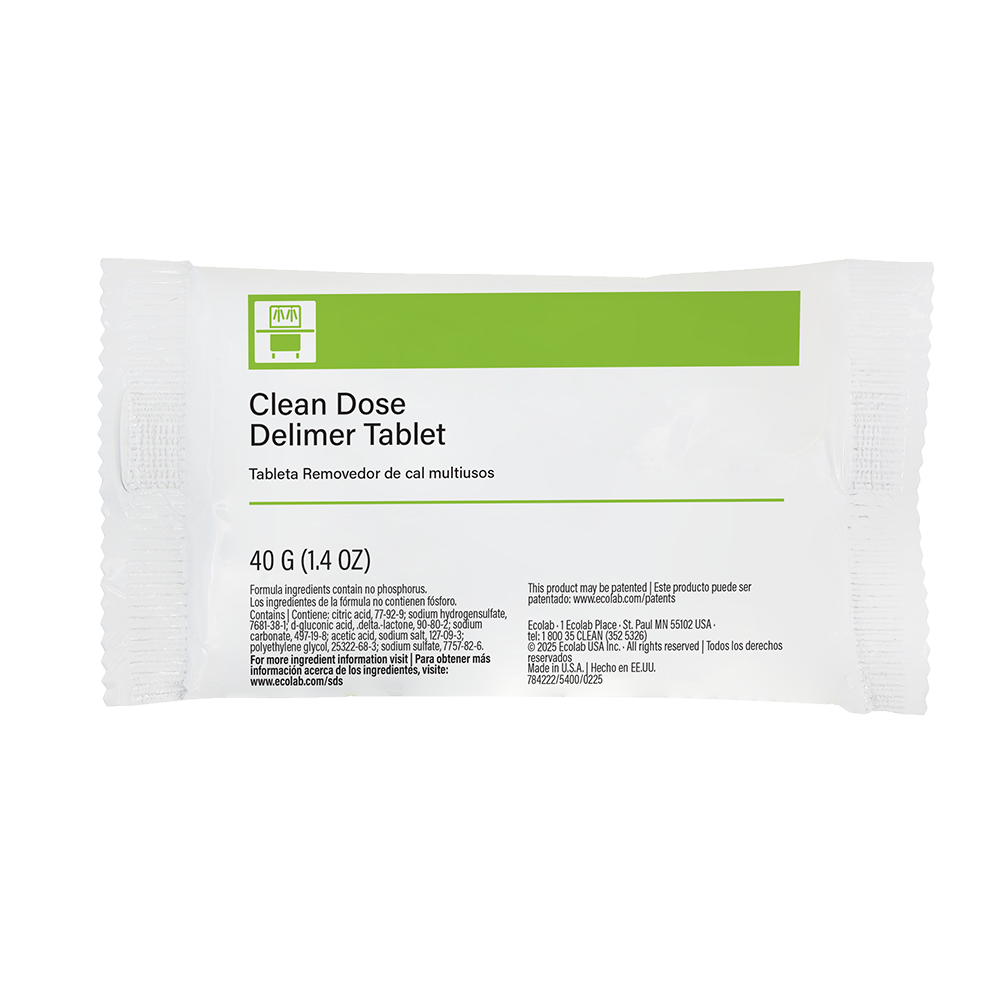 Effectively eliminate lime scale and hard water deposits on dishmachines, surrounding stainless steel, and restrooms with FaciliPro Clean Dose Delimer.